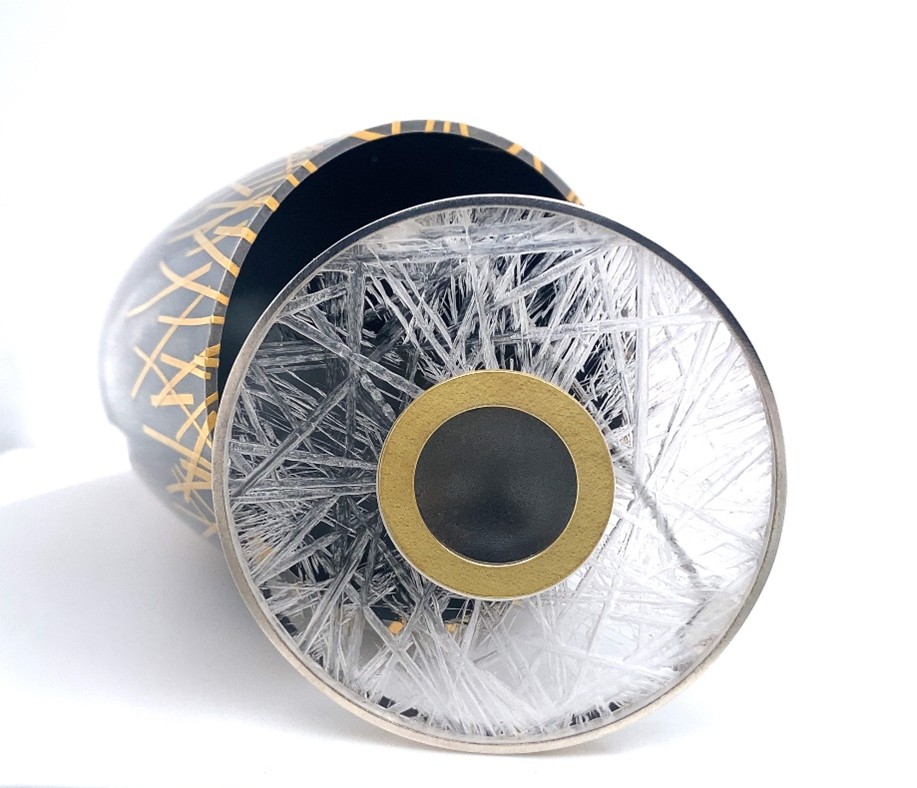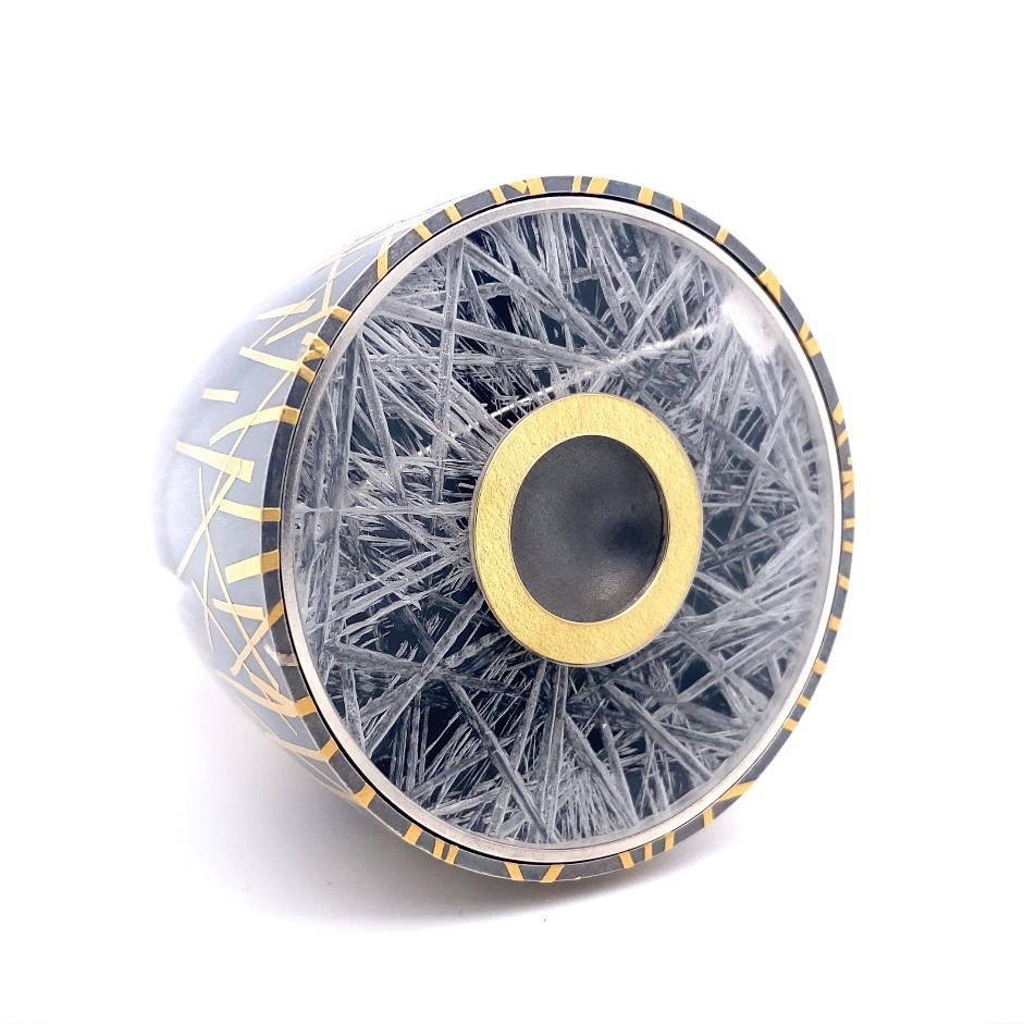 Eerie encompasses the tension between precision making and nature’s persistence. The hard geometric shape in concentric cyclinder form and anchored by the square lip at the top of the vessel is met by a flowing band of gold that drifts across its surface like feathered wings seeking rest. This resolves at the top of the vessel in the nest of interwoven gold around the aperture. This juxtaposition of form and texture evokes cycles of emergence and containment. The vessel as both boundary and invitation, a moment of stillness where the organic and the constructed briefly coexist.