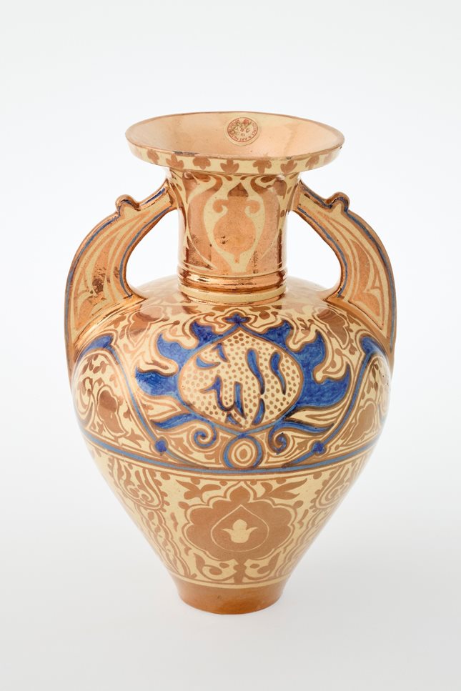 To place these reproductions into context, we studied the phenomenon of the rediscovery and revival of Spain's Islamic past, which developed in the 19th century, within a cultural climate of European interest in all things considered old or exotic. Spanish ceramics were amongst the objects experiencing this cultural revival, with entrepreneurs capitalizing on the widespread interest in Spain's past; as a result, potters and factories began making reproductions of these ceramics by incorporating the same techniques, forms, and decoration found in earlier pieces, as well as merging them with more recognizable 19th c. Alhambresque designs. The Alhambra Vases, in particular, inspired countless ceramic copies and miniatures as they were recognized as masterpieces of Spanish Islamic art. The National Museum owns one such example, a small lustered vase that reimagines the decoration and shape of its earlier predecessors.