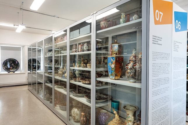 Returning to our museum visit and engagement with the ceramics, it is interesting to examine the Visible Storage space in which the objects were housed. At first, the visible storage puzzled us. On the one hand, the collection pieces lacked a central exhibition space. However, this is a problem that every museum faces, with hundreds of artifacts stored that cannot be viewed by the public, but also cannot be exhibited in the galleries due to a lack of space. On the other hand, this intermediate, halfway point between storage and display allowed us access to teaching and observing the collection, which would not have been possible if it were in actual storage.