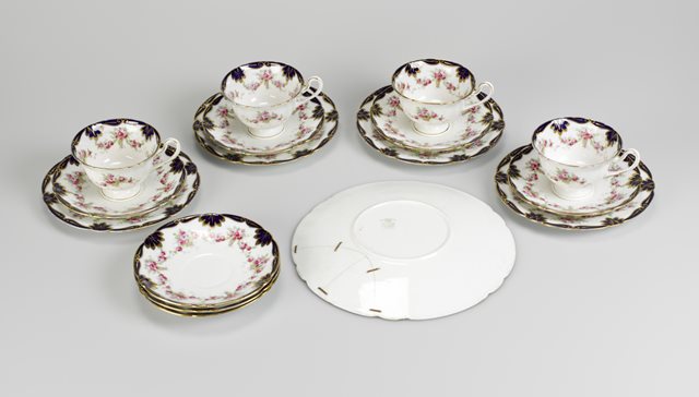 Celeste Smith stayed in Ireland and kept this tea set. The tea set was the only surviving object from the family's time at 117 Morehampton Road. She recounted that this tea set was laid for breakfast the morning of Bloody Sunday. She believed it was damaged during the assassinations. The service is incomplete, and the serving platter is broken (with repairs). Smith also remembered new wallpaper – red rose flock – in the rooms (her mother's family owned a decorating business in Donnybrook) and recalled blood soaking into the wallpaper.