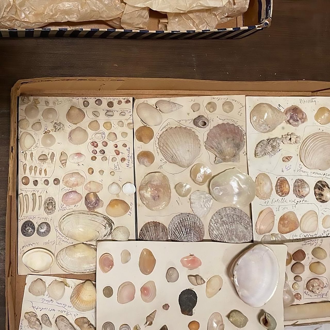 An interesting note about the packaging is that nothing is made of plastic. The containers are made from cardboard, tin or copper. They highlight domesticity. Boxes of soup squares, egg cartons, typewriter ribbons and cigarette boxes present an insight into the domestic lifestyle of museum staff. It also, unintentionally, gives us a glimpse into the most used items of the time. The social identity of the Irelands pre-commercialised plastic era was a time when most women stayed in the home after marriage, while men worked outside the home and were considered the "breadwinners". We can see this reflected in the types of packaging the accessioned objects were held in. Cigarette, cigar and matchstick boxes dominate the collections, telling us these were the most common containers present, likely from the men of the day smoking their contents, and soup square boxes and dress boxes were obtained from the women of the households. The type of packaging also gives us a view of social class and standing. A dress box from Switzer & Co. (originally on Grafton Street, Dublin and now known as Brown Thomas) with ‘Summer Frock’ written on the back in pencil, suggests a higher income. The Egyptian cigarettes highlight travel or importation expense. Additionally, envelopes were often used to store dried, flattened, marine specimens. Typically, they were sent back from exotic locations like Indonesia, Australia, or the jungles of Burma. The envelopes found in the museum collection were usually titled with ‘On Her Majesty’s Service’ or ‘On His Majesty’s Service’ giving us a hint as to who the British monarch of the time was, pre-Irish independence.