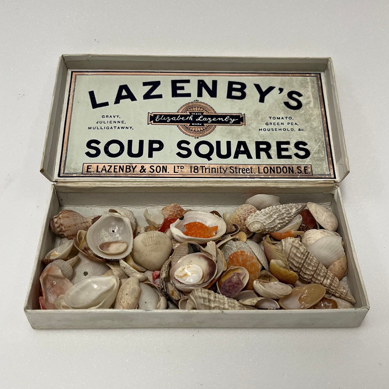 Most of the packages used were boxes or tins. These were generally cigarette or cigar boxes, pill, soup, match, dress, and book boxes, egg cartons, and cigar tins, with the newspapers of the time cocooning the object or specimen. It might be assumed that the objects and specimens went into the packaging around the same era as the boxes were made. However, the ages of the boxes do not necessarily correlate to the time the object was placed in them. But it does give a good insight into the historical time period.