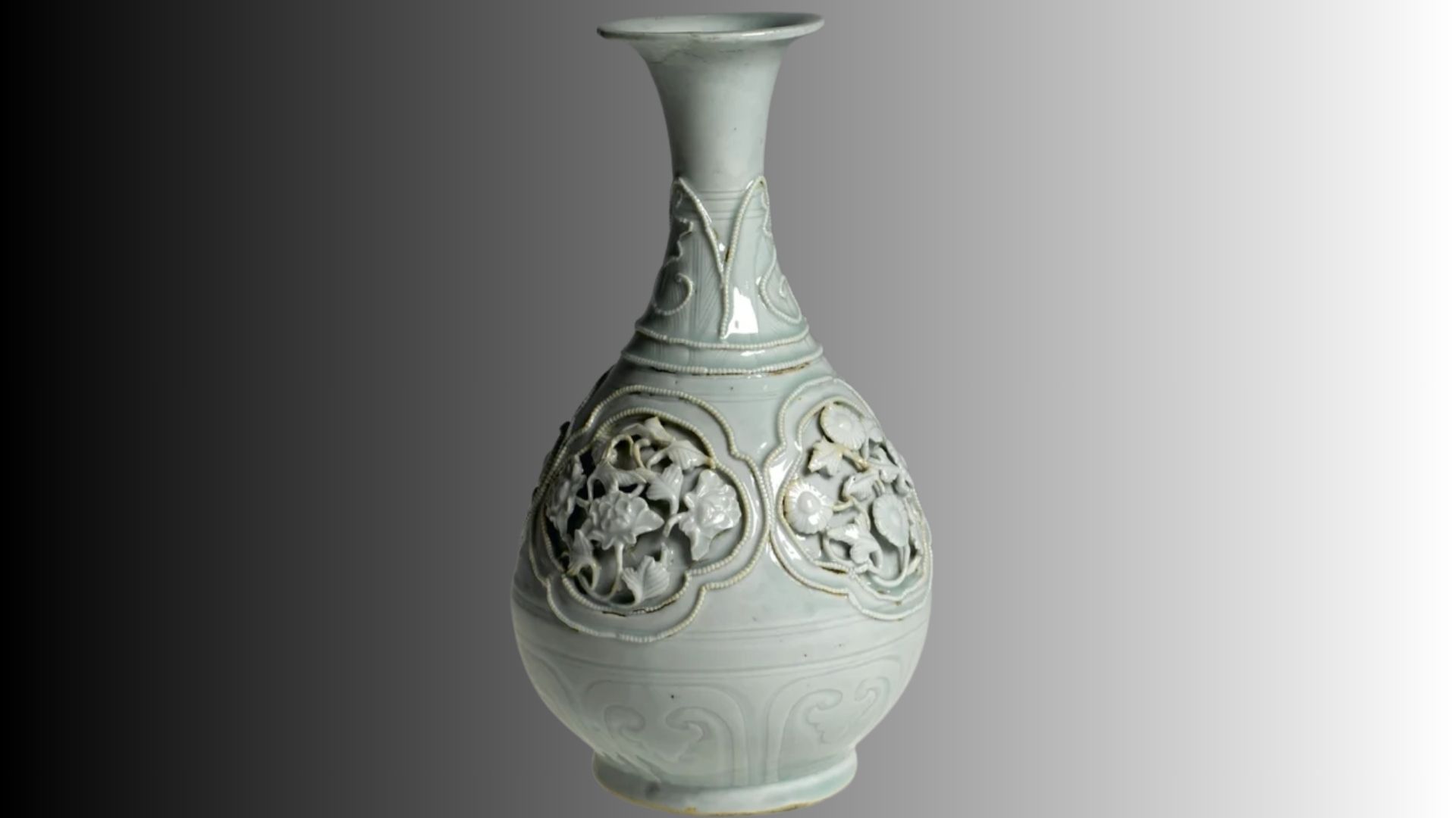 The vase itself isn’t exceptional at first glance and could easily be disregarded were it not for its much-travelled story and survival throughout centuries of upheaval and transfer between owners. It is pear-shaped with decorations of flowering plants around the body and neck. It is 28cm in height and has a pale blue-green glaze known as Qingbai. For an object that is thought to be over 700 years old, it is in remarkable condition and has only minimal damage with little of it visible to viewers.